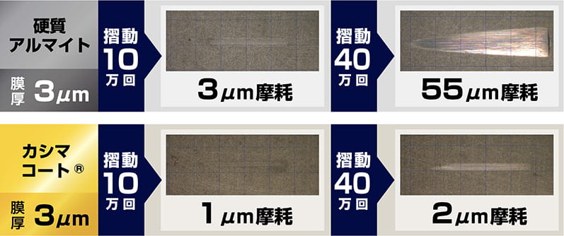 結果:硬質アルマイトは10万回で3μ摩耗、カシマコートは40万回で2μ摩耗