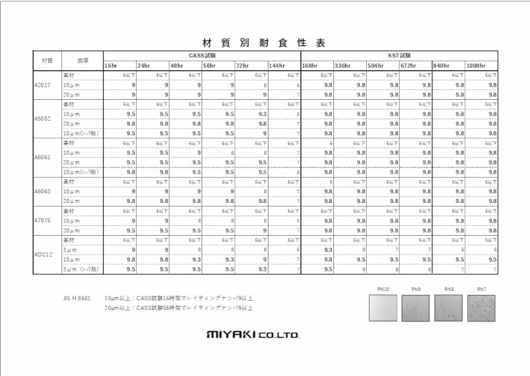 耐食性評価は JIS H 8601 のレイティングナンバー基準を参考に、
